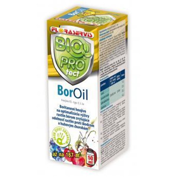- Jednozložkové boritanové listové hnojivo BorOil v ošetrených rastlinách optimalizuje výživu rastlín bórom a tým zvyšuje množstvo a kvalitu výnosu plodín. Vodorozpustný bór vo forme bóretanolamínu v hnojive je veľmi rýchlo absorbovaný pletivami rastlín.