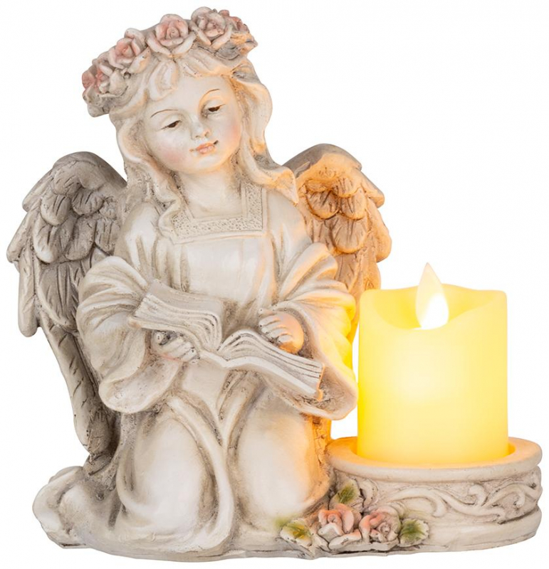Keramická dekorácia anjela s knihou a sviečkou je vkusná a decentná ozdoba vhodná nielen na hrob, ale aj ako dekorácia do smútočných aranžmánov a ikebán. Obsahuje sviečku s efektom pohyblivého plameňa a ochranný kryt na sviečku. Rozmery: 17,5x14,5x17,5 cm.