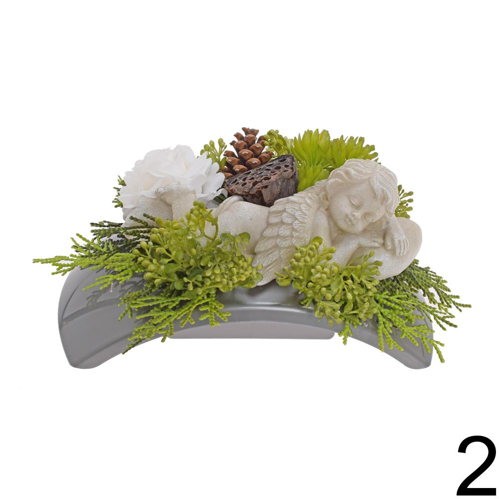 Smútočná väzba je elegantný aranžmán, ktorý kombinuje prírodné prvky s jemným dizajnom. Obsahuje anjela, ktorý leží na podklade s kvetmi a šiškami. Tento produkt je ideálny na vyjadrenie sústrasti a úcty. Vhodný je na pohreby alebo ako spomienka na blízkych. Jeho jemné farby a detaily dodávajú pocit pokoja.