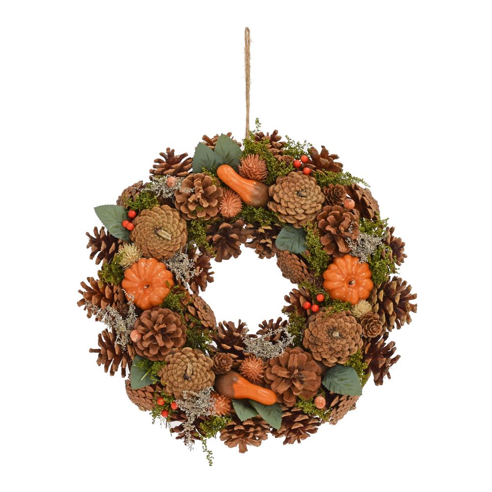 Veniec s dekoráciami z tekvíc, šišiek a zelene. Ideálny na ozdobenie dverí alebo stien počas vianočného obdobia. Pridáva prírodný a teplý pocit do vášho domova. Rozmery sú 33,5 cm na šírku a 8,5 cm na hĺbku.